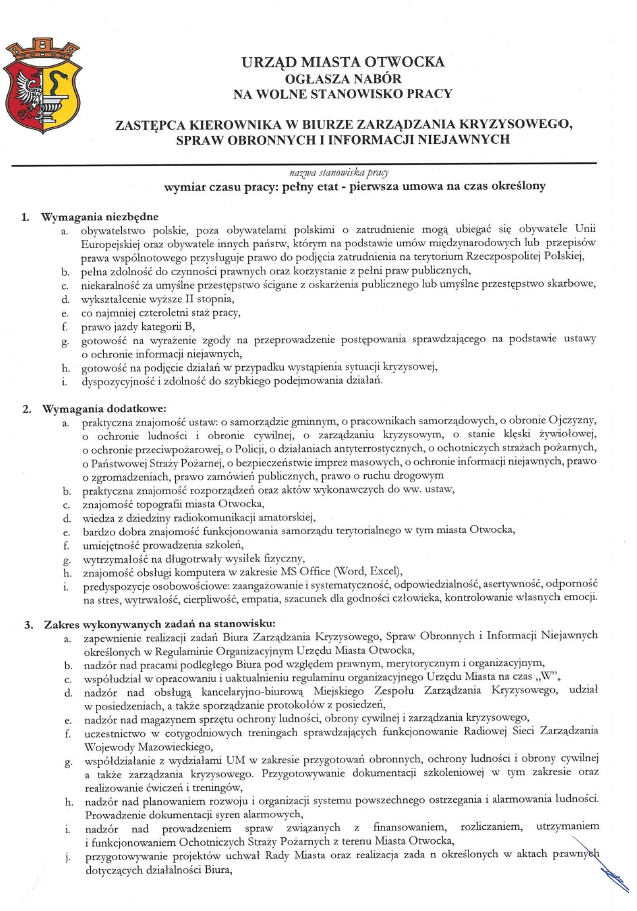 Poniżej dołączamy wymagania dla kandydata w ogłoszeniu o naborze na zastępcę kierownika w Biurze Zarządzania Kryzysowego Spraw Obronnych i Informacji Niejawnych UM Otwock.