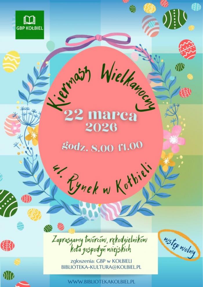 Gminna Biblioteka Publiczna w Kołbieli organizuje coroczny Kiermasz Wielkanocny, który zaplanowano na niedzielę, 22 marca 2026 roku. Wydarzenie odbędzie się na placu przed kościołem parafialnym przy ulicy Rynek. Stoiska będą dostępne dla odwiedzających od godziny 08:00 do 14:30, co pozwoli mieszkańcom oraz gościom na dokonanie zakupów w godzinach przedpołudniowych.