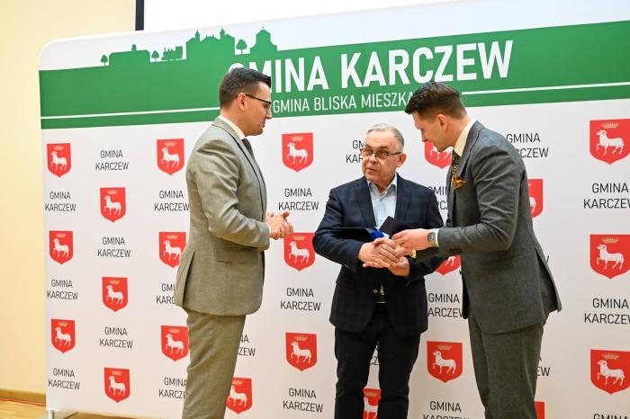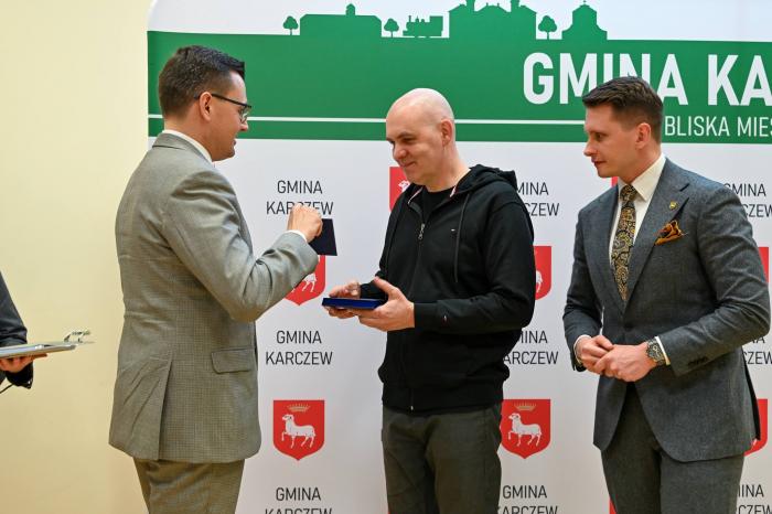 [ Dr Łukasz Maurycy Stanaszek odbiera nagrodę od burmistrza Michała Rudzkiego. Z prawej przewodniczący Piotr Kwiatkowski. Fot. Gmina Karczew]
