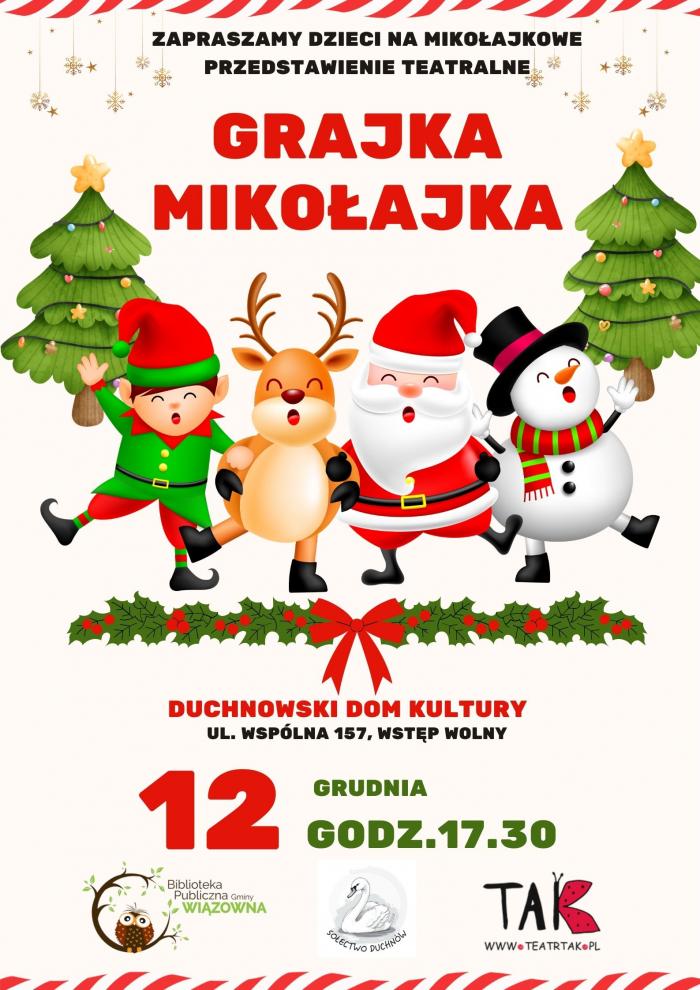 Przyjdźcie 12 grudnia 2025 roku (czwartek) do Duchnowskiego Domu Kultury (ul. Wspólna 157), aby wspólnie przeżyć przygodę ze spektaklem „Grajka Mikołajka”.