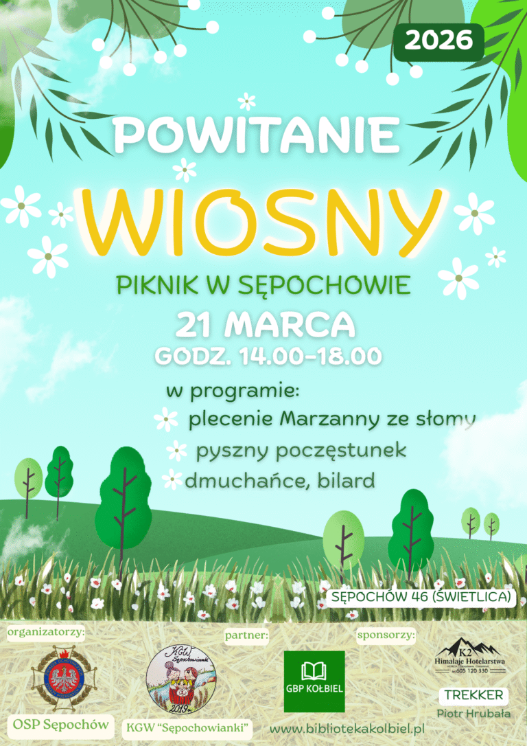 W Sępochowie odbędzie się piknik rodzinny z okazji powitania wiosny, zaplanowany na sobotę, 21 marca 2026 roku. Wydarzenie rozpocznie się o godzinie 14:00 i potrwa do 18:00 w świetlicy wiejskiej pod adresem Sępochów 46. Organizatorami spotkania są Ochotnicza Straż Pożarna w Sępochowie oraz Koło Gospodyń Wiejskich „Sępochowianki”, przy współpracy z Gminną Biblioteką Publiczną w Kołbieli.