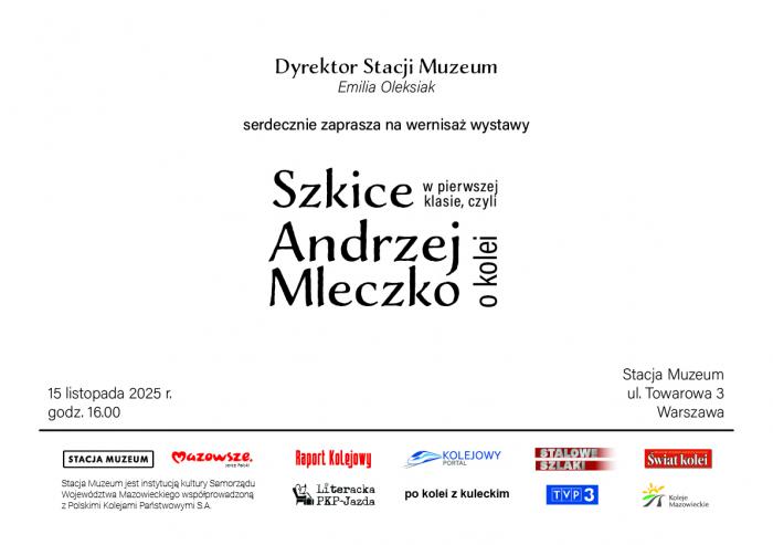Andrzej Mleczko ma na swoim koncie ponad 40 tysięcy rysunków, ponad 50 albumów i liczne wystawy w Polsce i za granicą. Jego prace bawią, prowokują i skłaniają do refleksji. Wernisaż w Stacji Muzeum to okazja, by zobaczyć kolej oczami artysty i przekonać się, że rozkłady jazdy to nie jedyne źródło niespodzianek na torach.