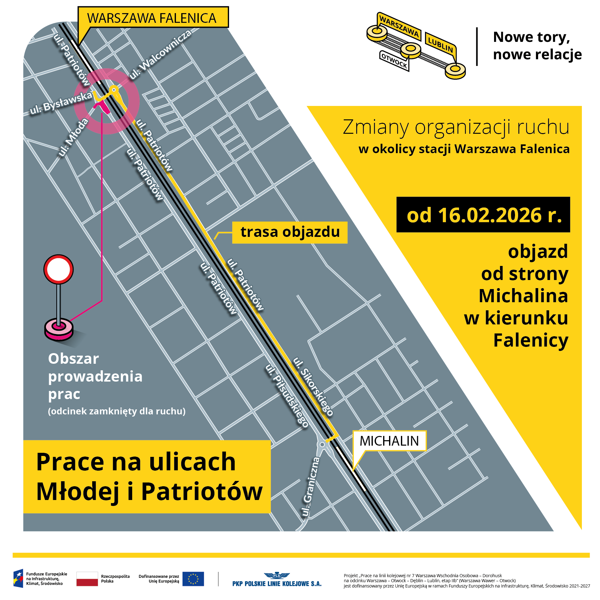 Objazd zostanie poprowadzony jezdnią ul. Patriotów po drugiej stronie torów kolejowych. Przejazd przez tory będzie możliwy przy stacjach Falenica i Michalin.
