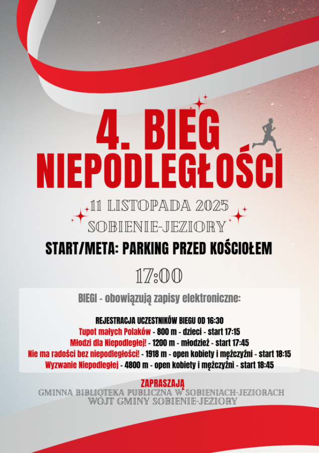 Galeria zdjęć prezentująca biegi niepodległościowe w powiecie otwockim. Pierwszy bieg odbędzie się 9 listopada w Malcanowie, a kolejne zaplanowano na Narodowe Święto Niepodległości. Trasy biegów prowadzą przez malownicze tereny, a uczestnicy mają do wyboru różne dystanse i kategorie wiekowe. Zapisy można dokonać online. Biegi to nie tylko okazja do aktywności fizycznej, ale także do wspólnego uczczenia ważnego święta narodowego i poczucia patriotyzmu. Zdjęcia ukazują atmosferę sportowej rywalizacji i integracji mieszkańców gminy.